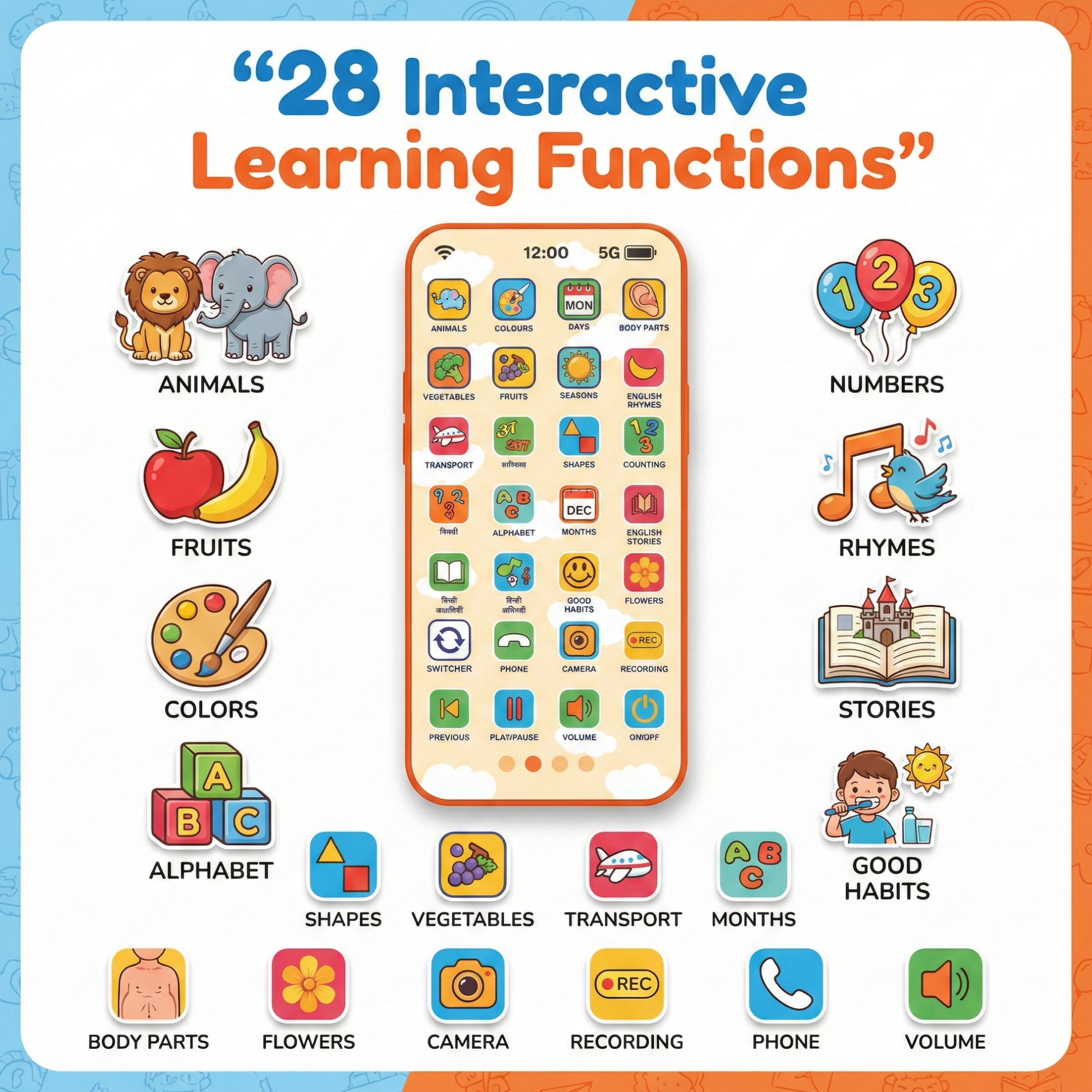 - 📚 Stories & Rhymes: Dedicated buttons play English Rhymes, English Stories, Hindi Poems, and Hindi Stories, turning playtime into storytime.